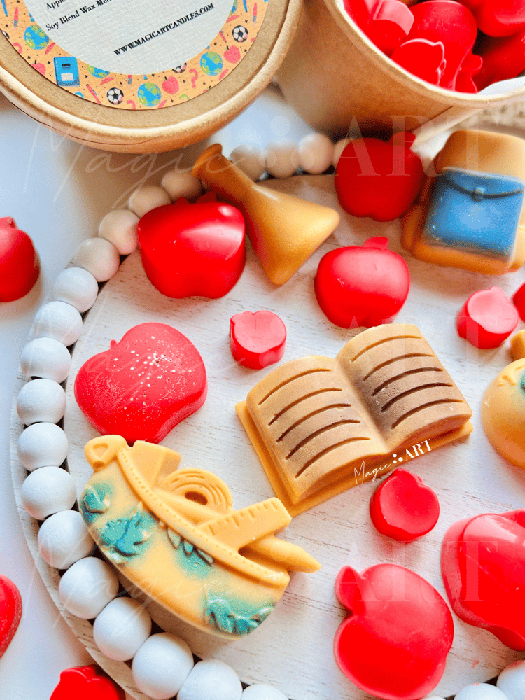 This wax melt cup is filled with apples of all sizes, plus one special classroom detail (a backpack, book, globe, etc.) to make each cup feel extra unique.