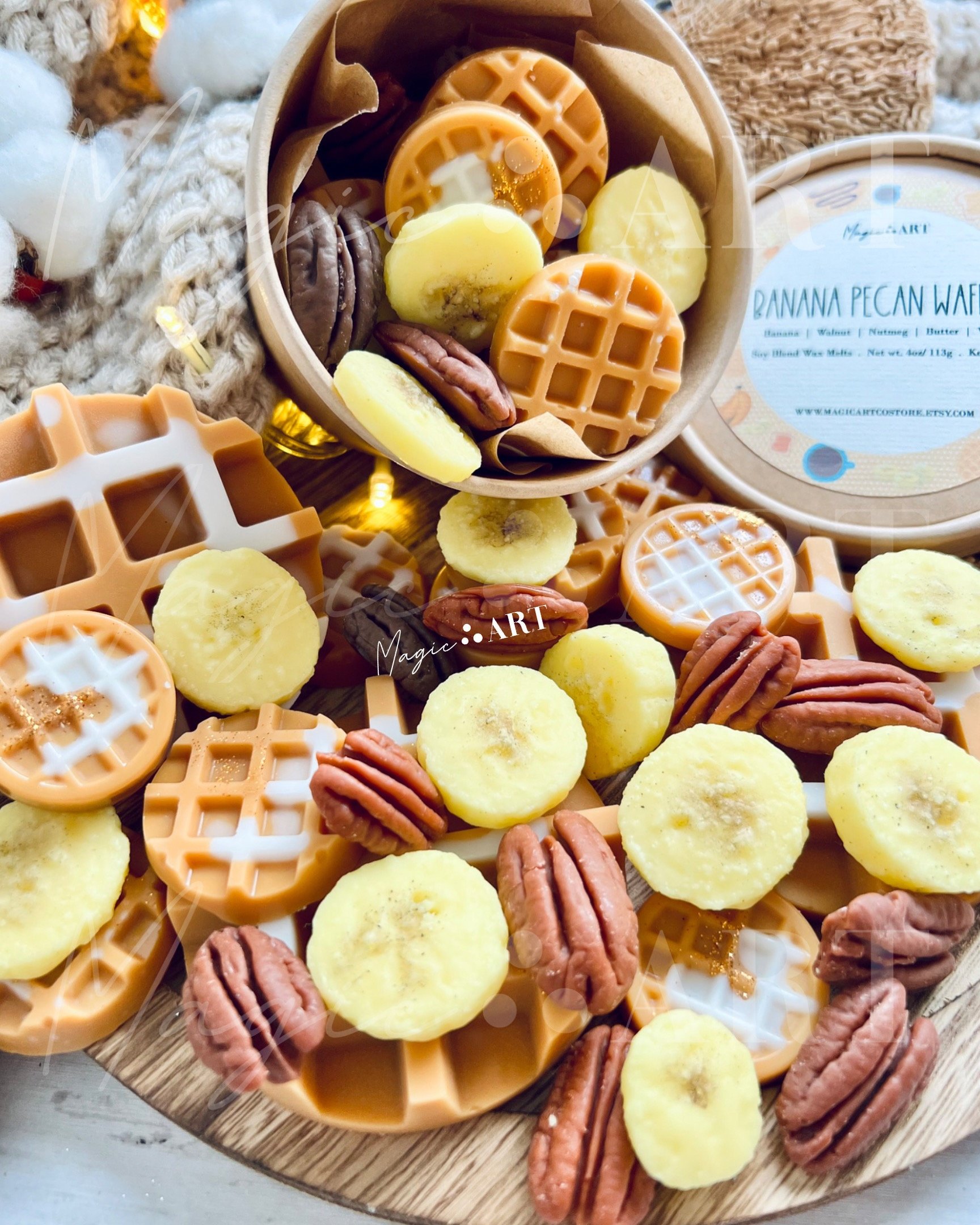 Banana Pecan Waffles Wax Melts will fill your home with the warm, comforting aroma of fresh-baked banana nut bread. You can choose from a 4.5 oz kraft cup or a 1.5 oz sample bag. Each melt is made from a soy/paraffin wax blend and premium fragrance oils with notes of banana, walnut, nutmeg, butter and vanilla.