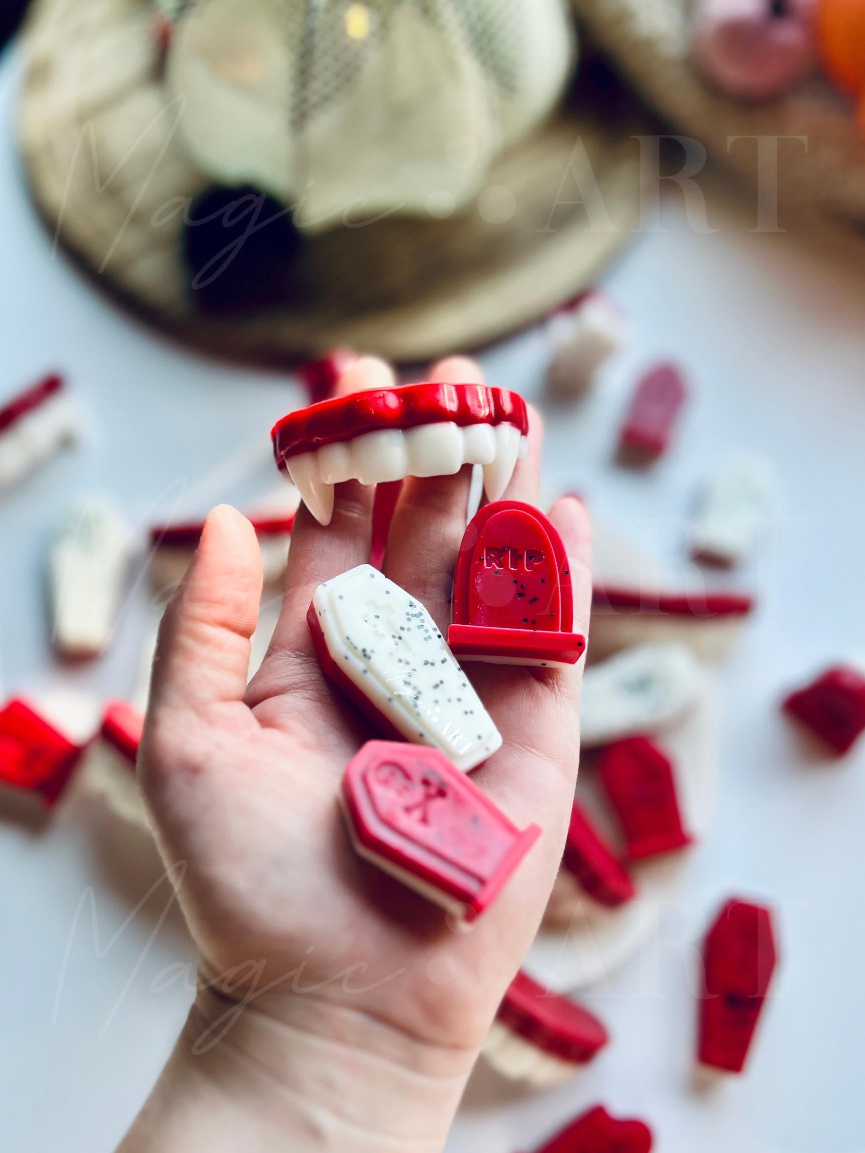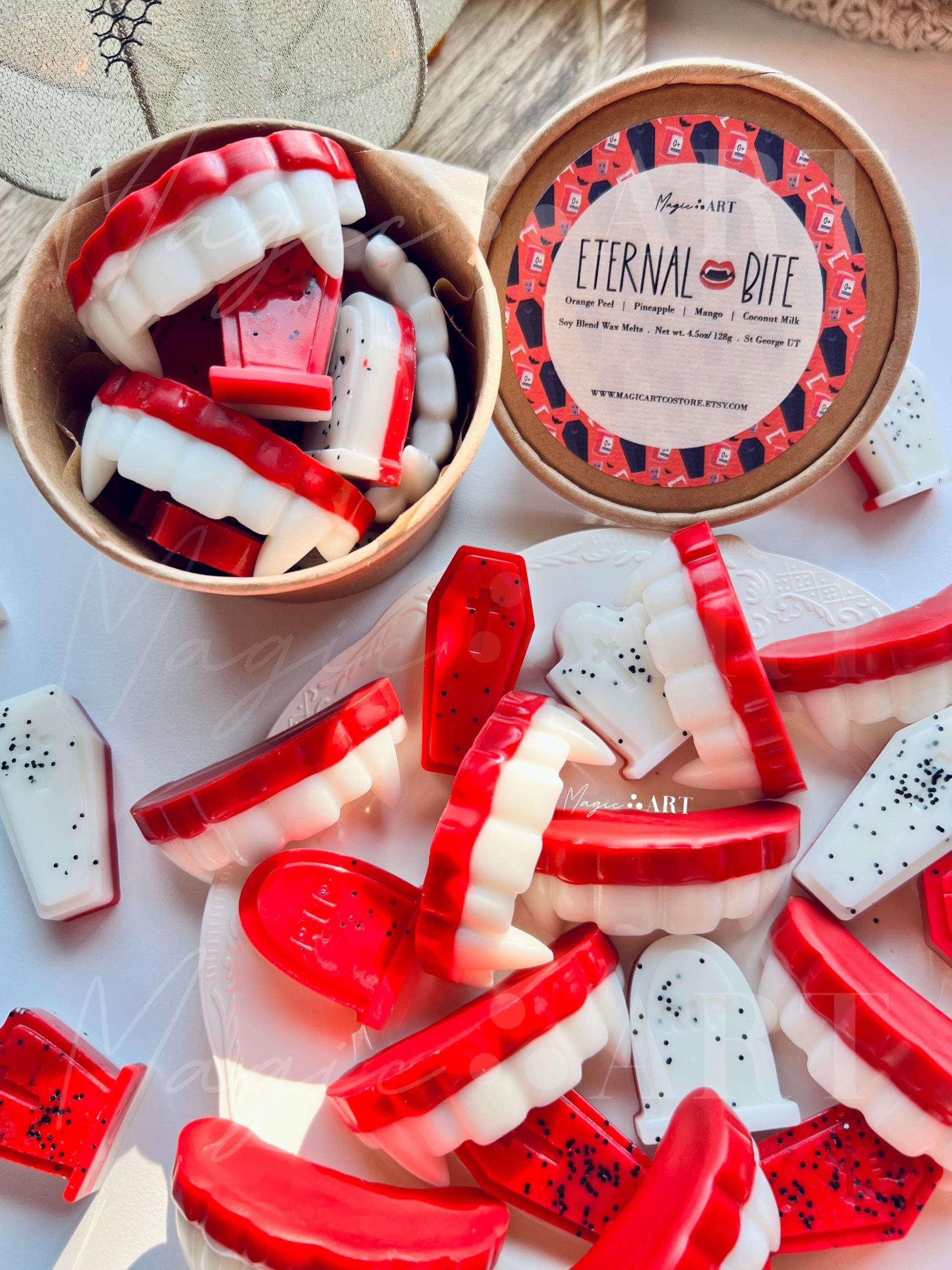 Eternal Bite Wax Melts are a unique Halloween gift for any vampire or spooky season enthusiast. Each 4.5 oz kraft cup is filled with a mix of wax melts scented with orange peel, pineapple, mango, and coconut milk. Our melts are made with a soy/paraffin wax blend and are measured by weight, ensuring a strong, long-lasting fragrance.