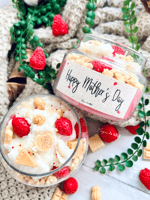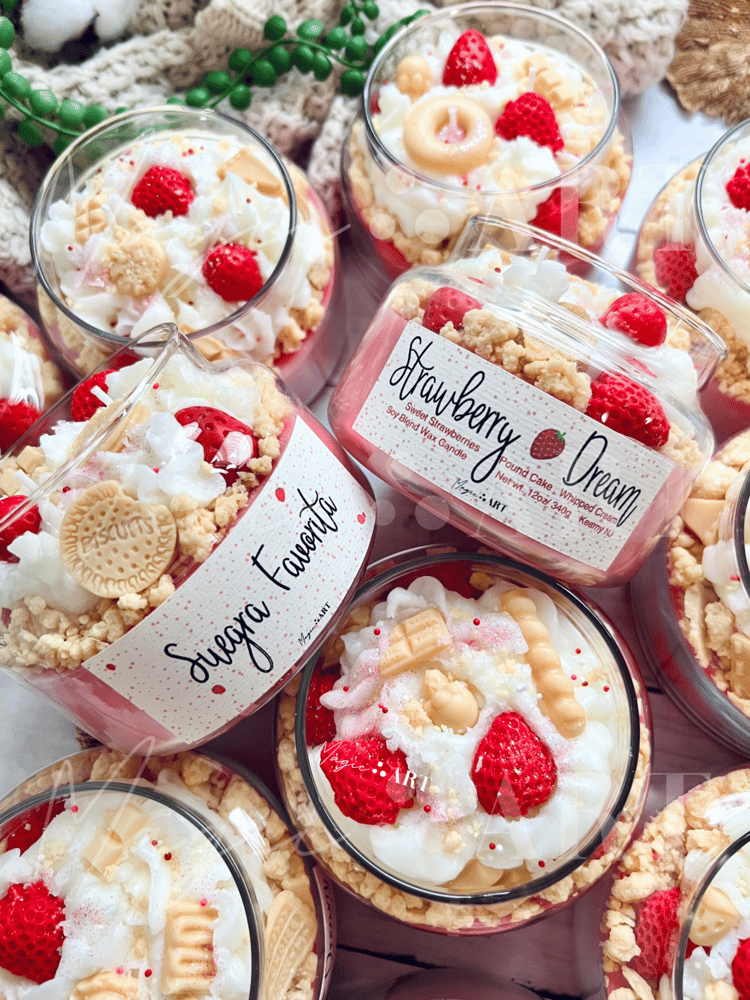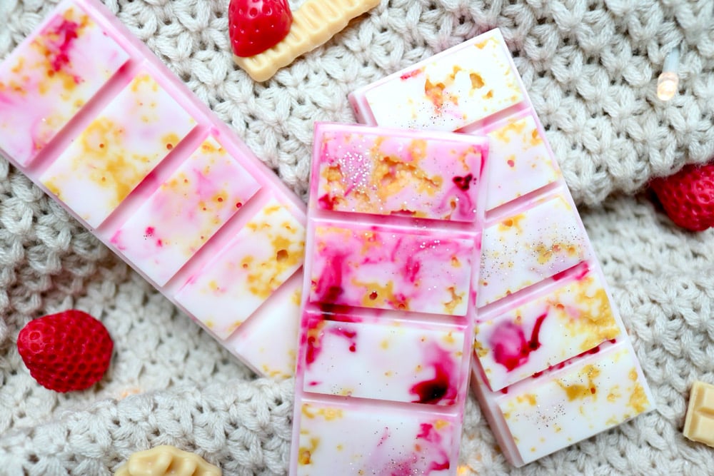 Strawberry Dream Candle & Snap Bars (wax melts) have a delightful aroma of freshly sliced strawberries accompanied by warm pound cake with whipped cream.